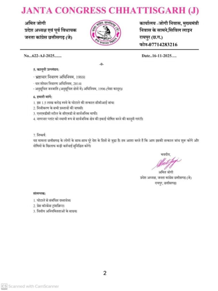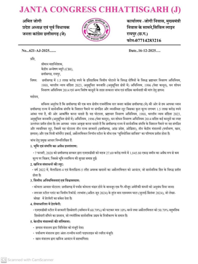 जनता कांग्रेस छत्तीसगढ़ (जे) के प्रदेश अध्यक्ष अमित जोगी ने केंद्रीय अन्वेषण ब्यूरो (सीबीआई) के निदेशक को पत्र लिखकर छत्तीसगढ़ के इतिहास के सबसे बड़े वित्तीय घोटाले की जांच की मांग की है। यह घोटाला 1.5 लाख करोड़ रुपये से अधिक की सार्वजनिक संपत्ति से जुड़ा बताया जा रहा है।इस बावत श्री जोगी ने प्रेस को जानकारी देते हुए बताया की इस घोटाले में नागरनार स्टील प्लांट की 26,000 करोड़ रुपये की संपत्ति, बैलाडिला लौह अयस्क खदानों का 85,000 करोड़ रुपये का मूल्य और भविष्य के राजस्व की 40,000 करोड़ रुपये की हानि शामिल है। जिसका कुल अनुमानित घोटाला 1.5 लाख करोड़ रुपये बैठता है।